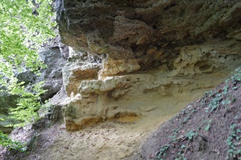 Leider sind nicht alle Schichten offen, also teilweise überwachsen. Aber ein Highlight ist weit oben der Übergang von der Oberen Süßwassermolasse zur Eiszeit/ Nagelfluh (linkes Foto).