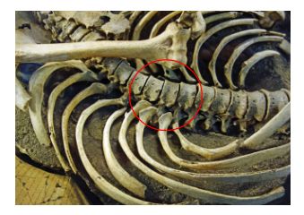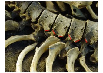Die braun markierten Wirbel des rechten Modells entsprechen den Funden des Danuvius guggenmosi. Die Beurteilung der Wirbelsäulenkrümmung bei Danuvius beruht auf den unterschiedlichen Winkeln, in denen die Dornfortsätze zum Wirbelkörper stehen.